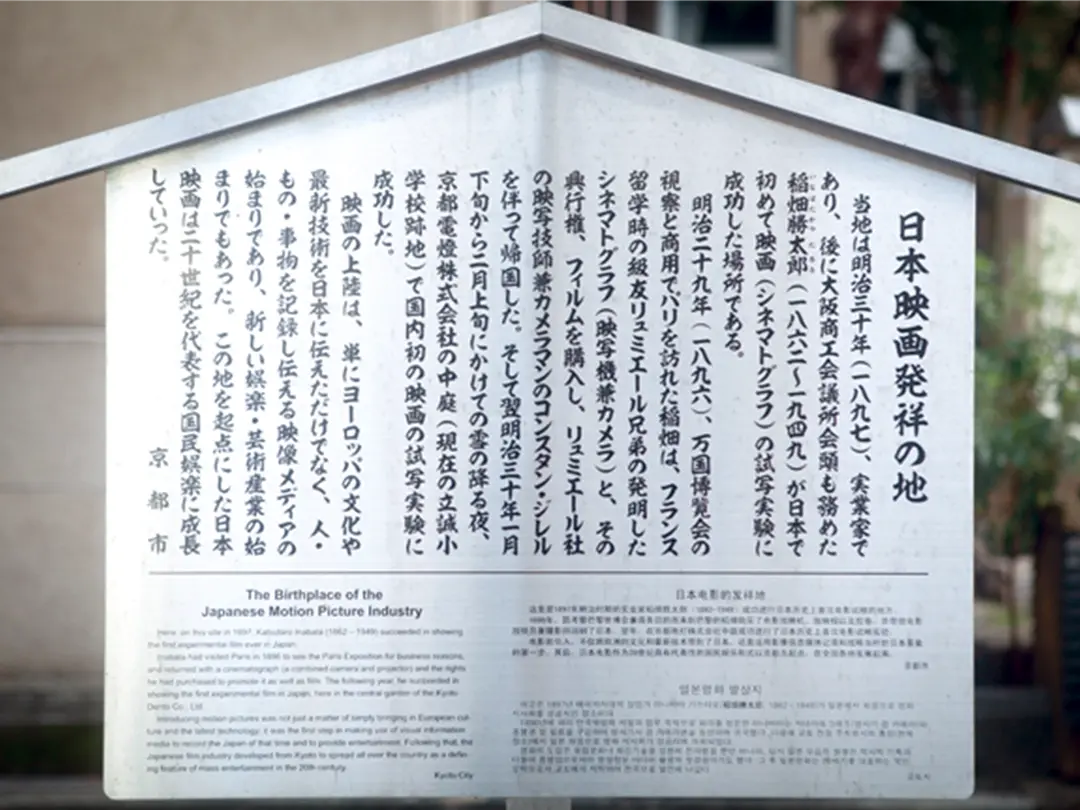 在世界電影的開頭,有一個故事,盧米埃爾兄弟發明的電影放映機於1895年在巴黎的大咖啡館向公眾開放,收費。※眾說紛紜這兩年後,從京都・西陣到巴黎留學的稻畑勝太郎,因為和盧米埃爾兄弟是同班同學,所以回國時帶回了《Cinematograph》,在“京都”的木屋町進行了日本首次試映,所以“京都”被認為是日本電影的發祥地。