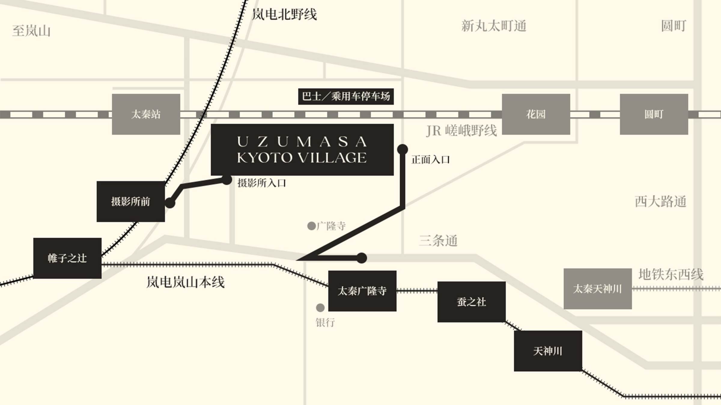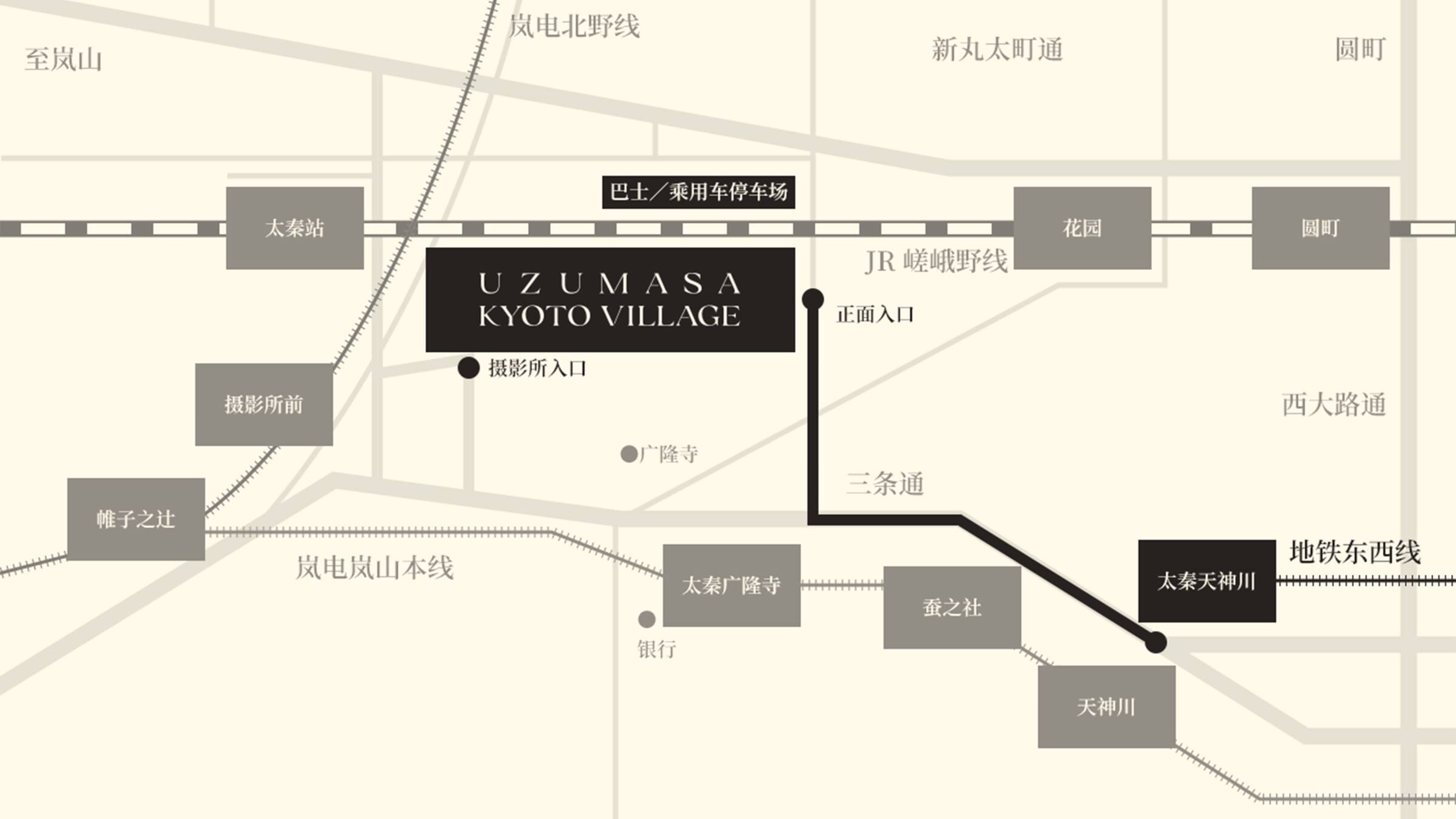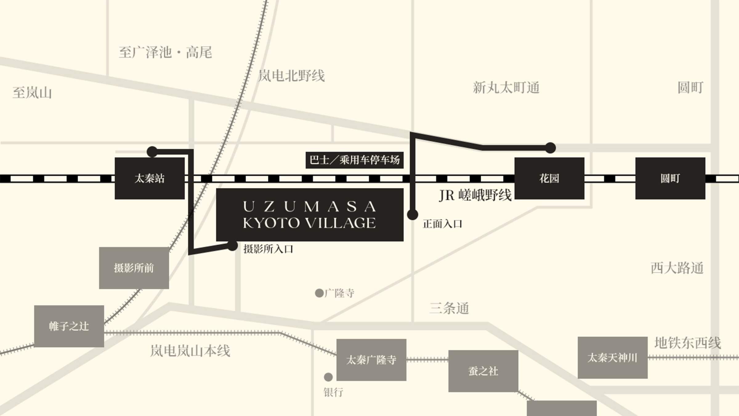 從嵐電「作所前站」步行2分鐘 / 從JR「渦正站」步行5分鐘 *村莊入村時間為下午5點,入園村時間為下午6點