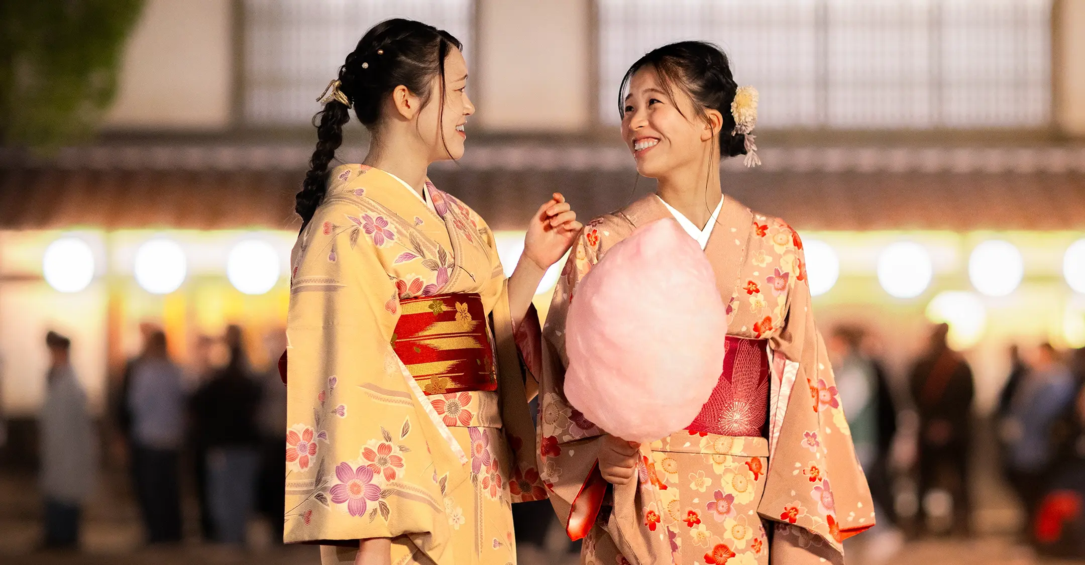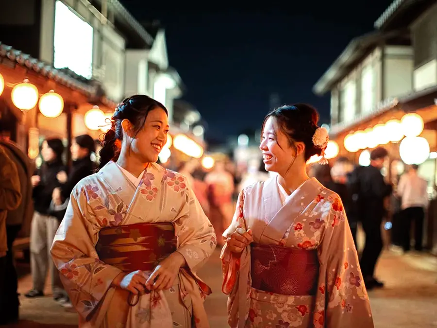 在燈籠和月光交匯的時間裡,身著和服的人們散發出與白天不同的光澤,顯得凜冽而美麗。