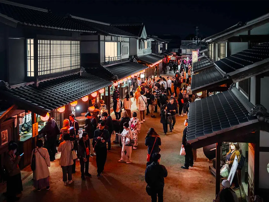 夕陽西下,燈籠亮起,一場專為成人打造的精緻夜晚就此拉開序幕。品嚐名店佳餚,暢飲美酒。賭徒的喧囂和酷刑的慘叫聲此起彼伏,迴盪在夜色之中。來體驗映畫村的另一面吧。